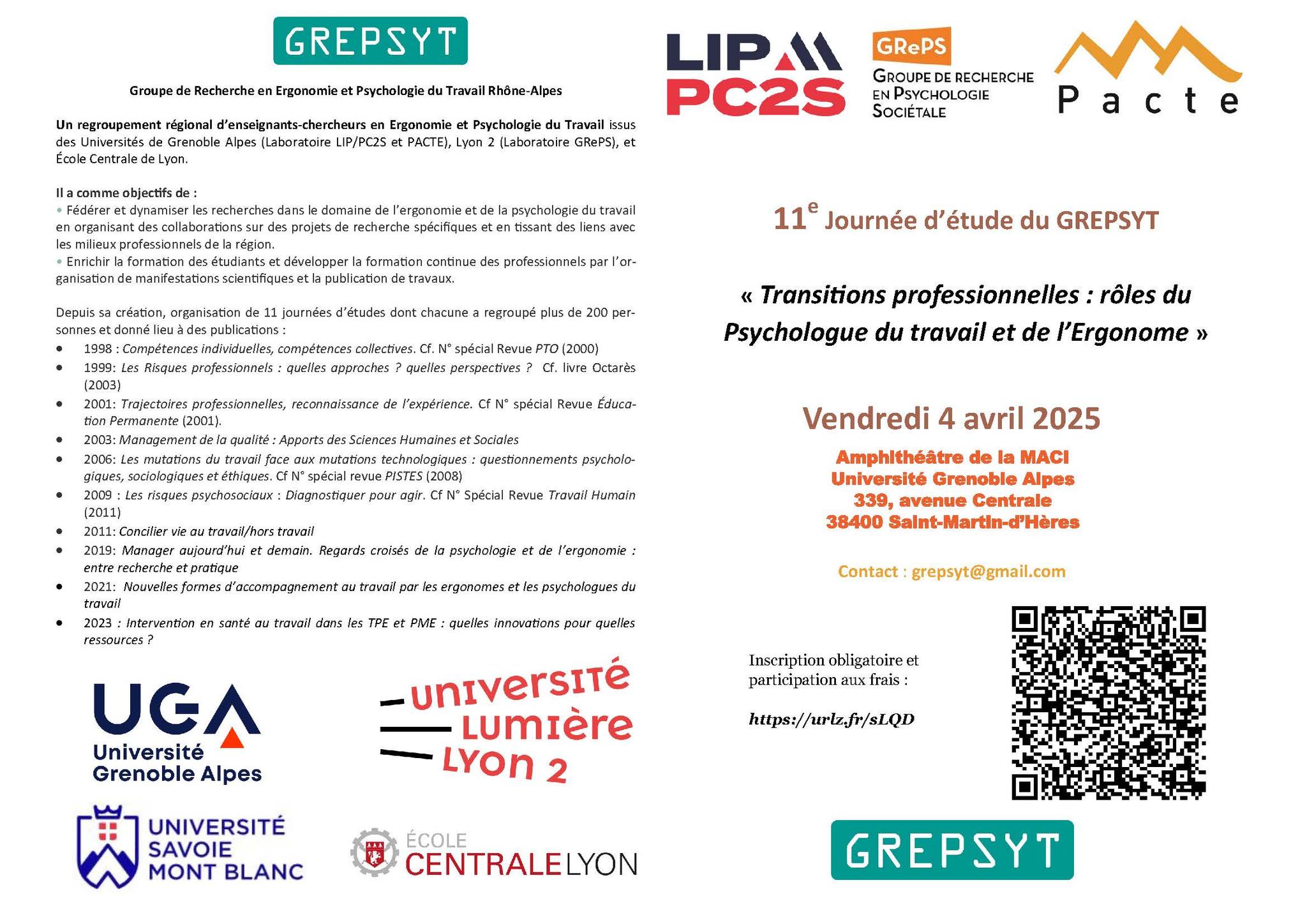 Le Groupe de Recherche en Ergonomie et Psychologie du Travail (GREPSYT)Le GREPSYT est un regroupement régional d’enseignantes-chercheuses et d'enseignants-chercheurs en ergonomie et psychologie du travail, en provenance des universités de Grenoble Alpes, Lumière Lyon 2, Claude Bernard Lyon 1 et École Centrale de Lyon, et appartenant à diverses équipes de recherche :♦ GRePS Groupe de Recherche en Psychologie Sociétale (UR 4163 / Université Lumière Lyon 2) ; ♦ Laboratoire Interuniversitaire de Psychologie LIP/PC2S (EA 4145 / Université Grenoble Alpes et Université de Savoie Mont Blanc) ; ♦ Laboratoire PACTE Politique Organisations (UMR 5194 / CNRS / Université Grenoble Alpes). Le GREPSYT a comme objectifs de : ♦ fédérer et dynamiser les recherches dans le domaine de l’ergonomie et de la psychologie du travail en organisant des collaborations sur des projets de recherche spécifiques et en tissant des liens avec les milieux professionnels de la région. ♦ enrichir la formation des étudiants et développer la formation continue des professionnels par l’organisation de manifestations scientifiques et la publication de travaux. |